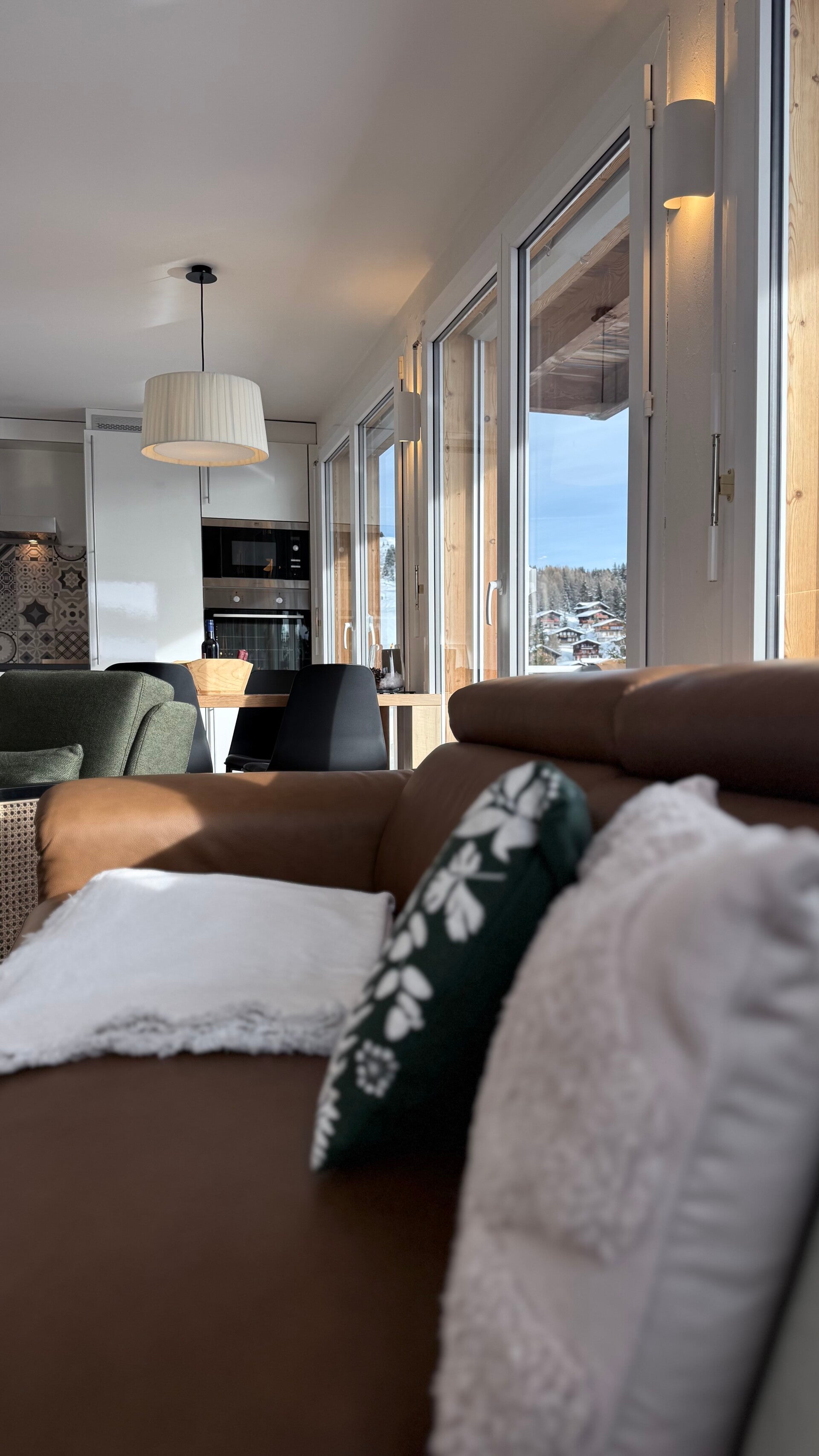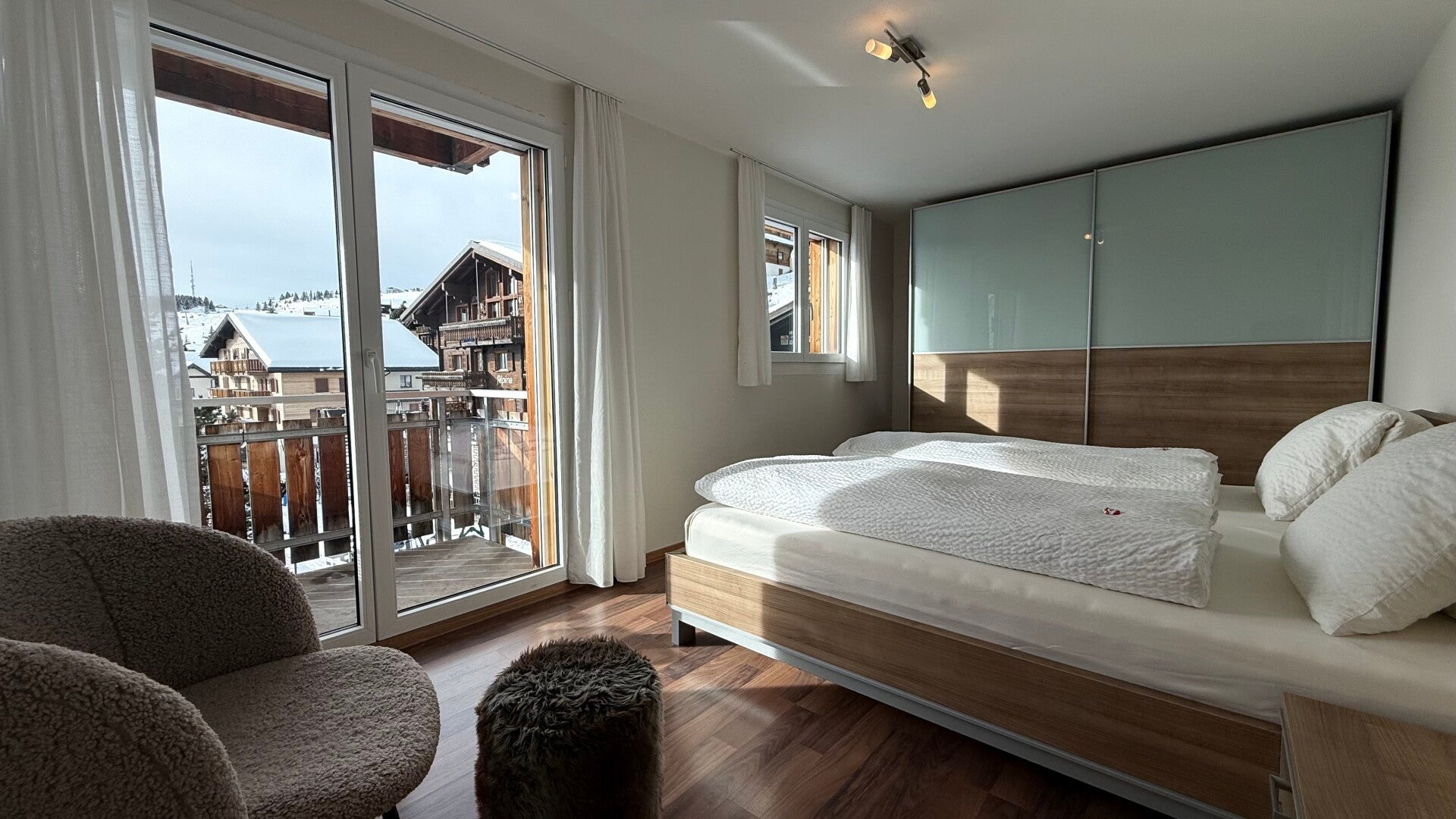 Die Wohnung verfügt über zwei separate Schlafzimmer – eines mit Doppelbett, das andere mit zwei Einzelbetten – sowie ein modernes Badezimmer mit Dusche und WC. Zwei Terrassen mit West- und Südausrichtung bieten einen spektakulären Blick auf die Walliser Bergwelt.